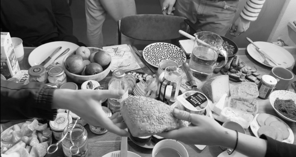 Erwachsenwerden ist schwer und das Bewusstsein (im Sinne von “sich bewusst sein”) über diese Welt ziehe ich wie einen großen Felsbrocken an dünnen Schnüren, die mir in die Hände schneiden, hinter mir her. Während vor meinem Fenster Autos die Straße hinabrollen und Menschen in beleuchteten Wohnungen ihrem Leben nachgehen, frage ich mich, wie ich es geschafft habe, über die Runden zu kommen, obwohl ich seit fast zwei Wochen nicht wirklich dazu gekommen bin, einzukaufen. Kaum setze ich einen Fuß vor die Tür, rauscht der Tag wie Taubenschwärme über den Dächern der Stadt an mir vorbei und ehe ich mich versehe, ist die Sonne von Osten nach Westen gewandert und ich krame wieder nach dem Schlüssel an meinem Hosenbund, öffne erst den Karabiner, die Wohnungstür und dann meinen Hosenstall. Ich schäle mich aus meiner Jeans, liege erschöpft in Unterhose auf meinem Bett und lasse die Eindrücke des Tages von mir fließen. Es muss sich etwas ändern und während ich mein Gehirn mit Reels ruhigstelle, denke ich darüber nach, wie ich es schaffe, wieder in meinen Körper zurückzufinden. Mein Screen zeigt mir Gesichter, die ich nicht kenne, Fit Checks, wütende PolitikerInnen, Videos von Dackelwelpen, Kriegsgebiete und schöne Menschen, die zu Diet Pepsi von Addison Rae tanzen. Ich raffe mich auf und auf der Suche nach etwas, was meinen Magen füllt, öffne ich die Kühlschranktür. Traurig schauen mir matschige, halb aufgeschnittene Gemüseteile entgegen. Ich versuche, mich an die vielen low-effort Gerichte von meiner for you-page zu erinnern und finde in meinem Gehirn doch nur KI-generierte Pferde, die plötzlich ihre Reiter abstoßen und anfangen Salsa zu tanzen. “Das ist doch sinnlos”, denke ich, mansche mir einen kleinen Rest Avocado auf ein Knäckebrot, klaue eine Banane von meinem Mitbewohner und mache mich auf den Weg zurück in mein Zimmer. Ich denke zurück an eine frühere WG mit meiner Freundin Marie. Nicht nur teilten wir uns einen Namen, sondern auch die Kleiderschränke, die Bodylotion und den Inhalt unseres Kühlschranks. Es war ein zelebratorisches Ritual, am Mittwoch oder Samstag Morgen gemeinsam auf den Markt zu gehen, uns mit frischem Gemüse und Obst einzudecken und nebenbei den Marktmann für gute Preise um den Finger zu wickeln. Essen war ein essentieller Teil unseres Lebens und gemeinsam oder für die andere zu kochen ein Akt der Zuneigung und Wertschätzung. Irgendwie muss ich lernen, das Gleiche auch für mich zu tun, realisiere ich, als ich in die halbreife Banane beiße und mit meiner Zunge den Pelz auf meinen Zähnen abtaste, der sich in Sekundenschnelle gebildet hat.
